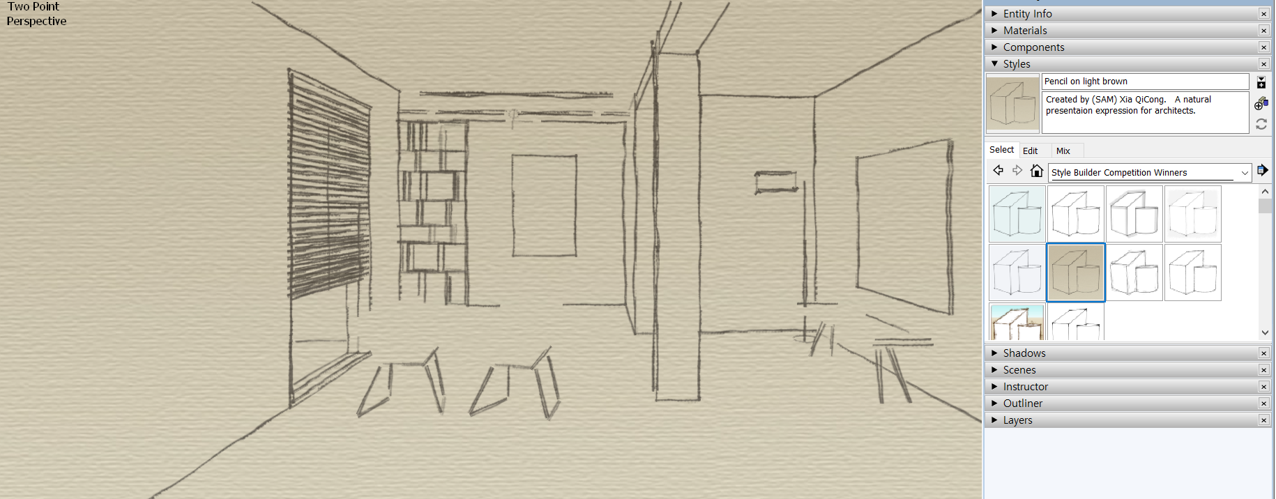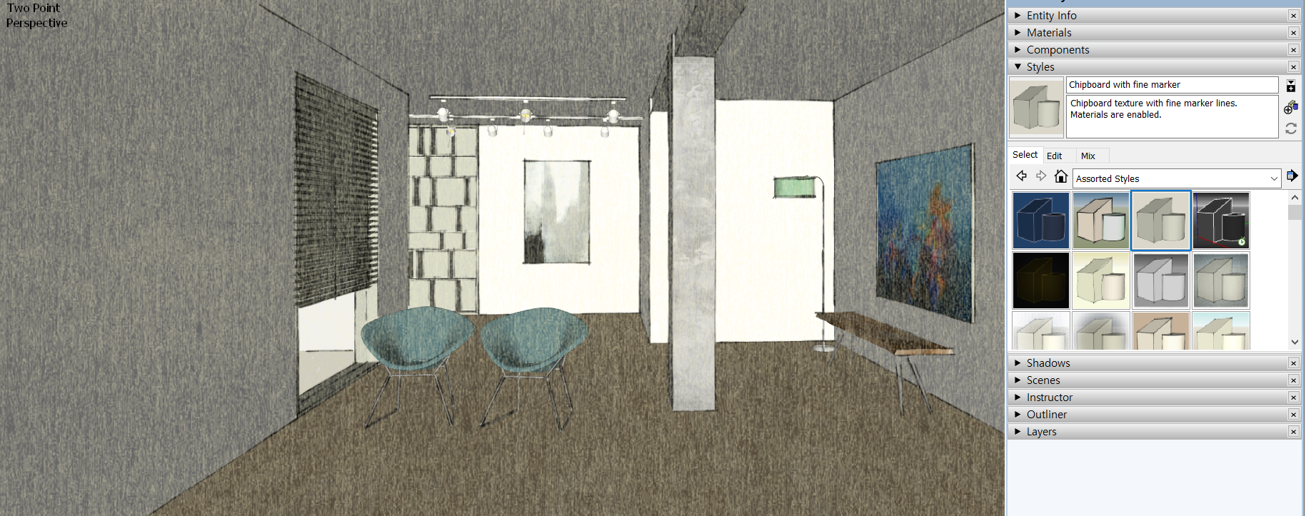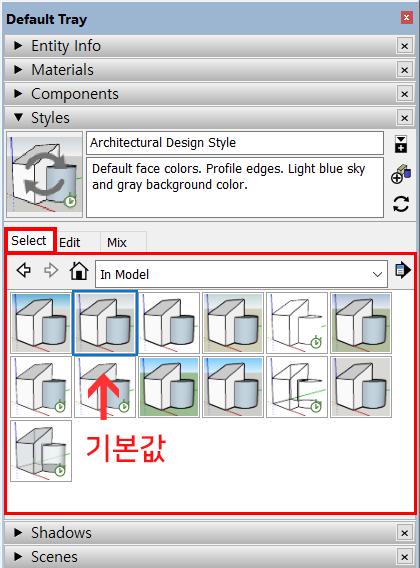 1. 스케치업 상에서 손 그림의 느낌 등 다양한 스타일을 선택해서 표현할 수 있습니다.