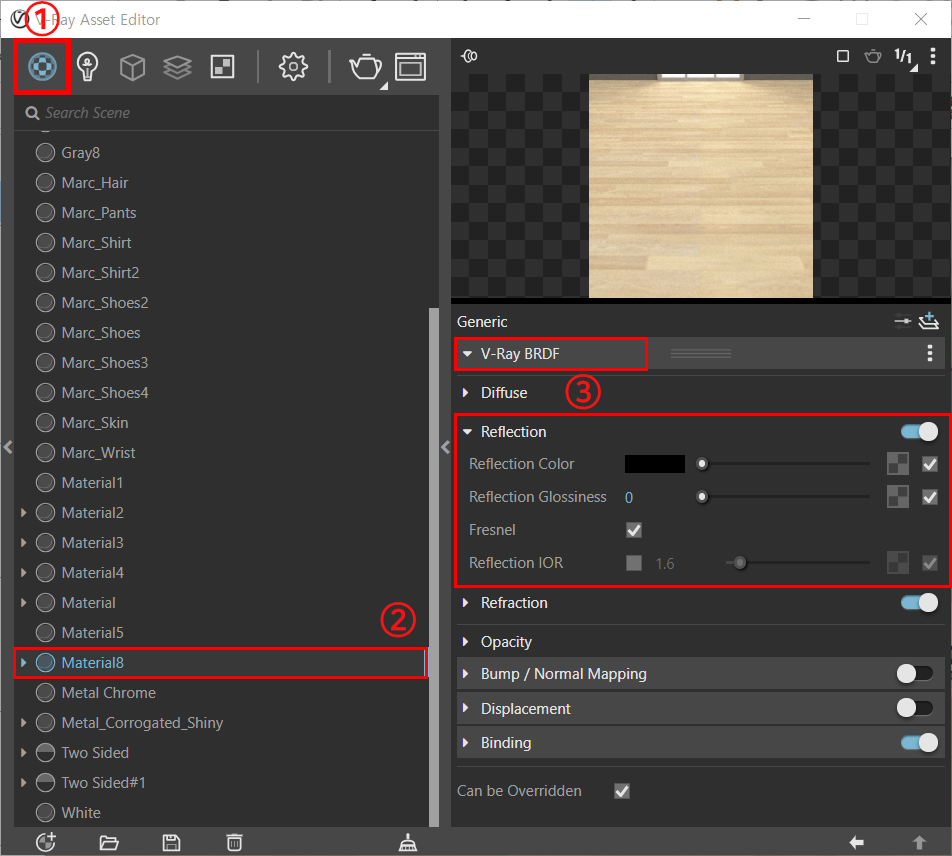 ② 값을 설정할 해당 재질을 클릭합니다. 우측에 재질에 대한 이미지가 나옵니다.