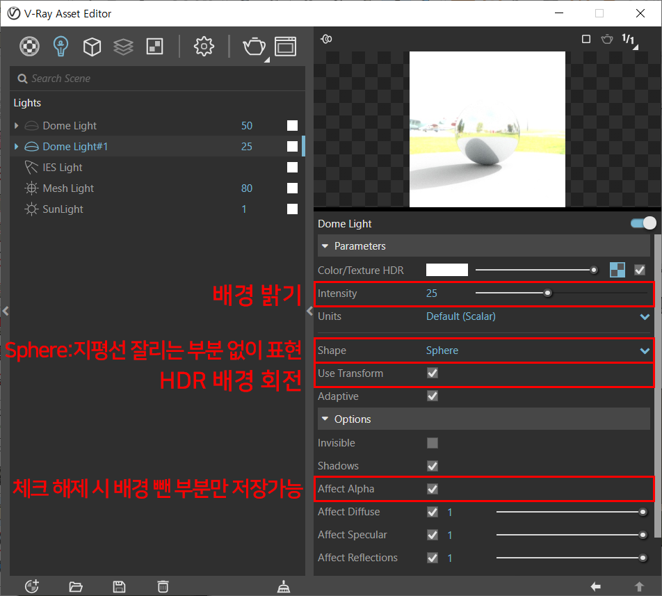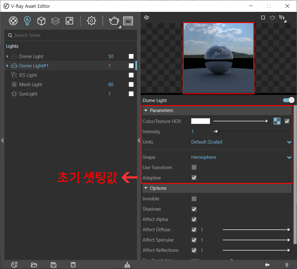 Shape 항목은 Hemisphere에서 -> Sphere 로 변경시켜줍니다.
