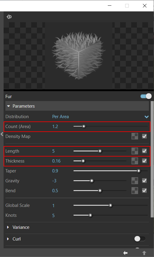 해당 Fur 을 클릭하고, Count(털 갯수) - Length(털 길이) - Thickness(털 두께) 값을 수정해줍니다.