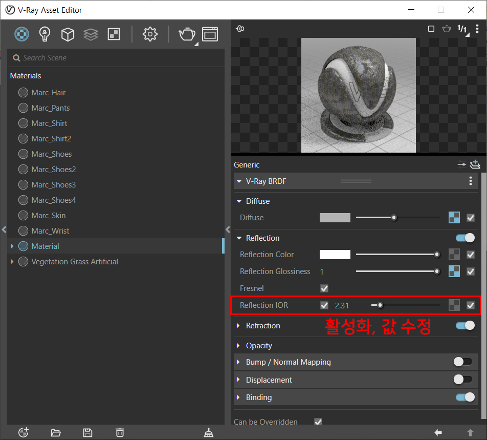 (Reflection IOR 항목은 재질의 밝기를 밝게 하던데, 설정이 잘못된 건지 잘모르겠다;;)