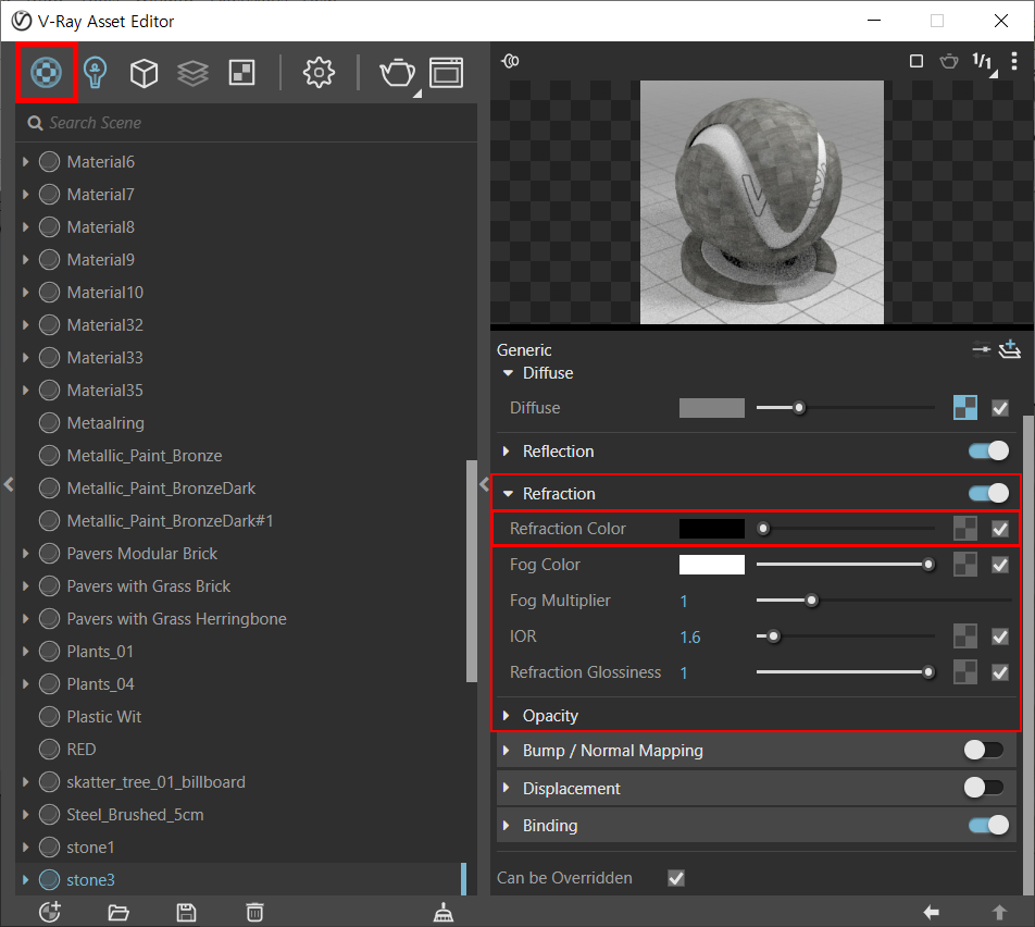 2. Asset Editor 창을 열어서 재질 탭을 클릭한뒤, Refraction Color 값을 수정해줍니다.
