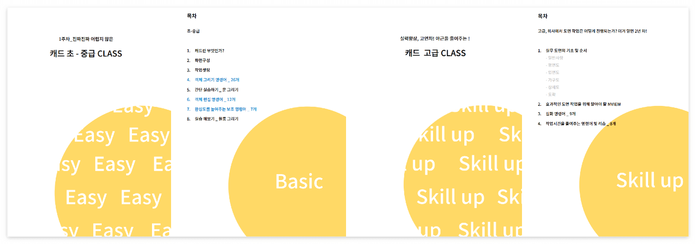 실무에 대한 내용이 포함되어 있습니다. 도면이 어떻게 구성되어져 있고, 실무에 어떻게 cad 가 적용되는지, 고급 명령어들과, 야근을 줄여줄 유용한 리습과 다양한 기능들을 배우고 실습 하실 수 있습니다. 수업은 1회 120분 수업으로 진행됩니다.