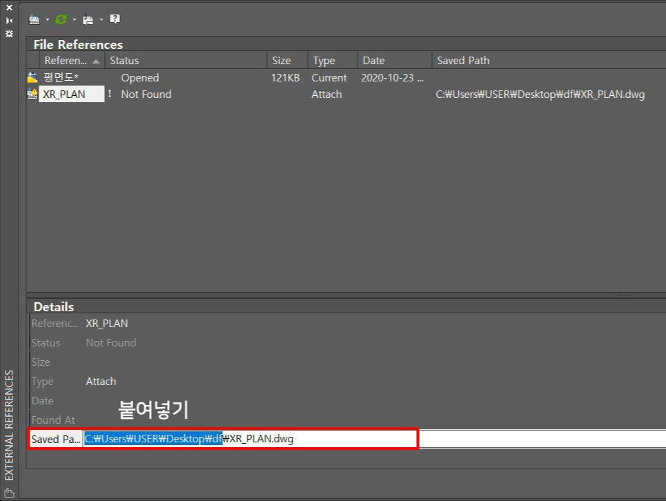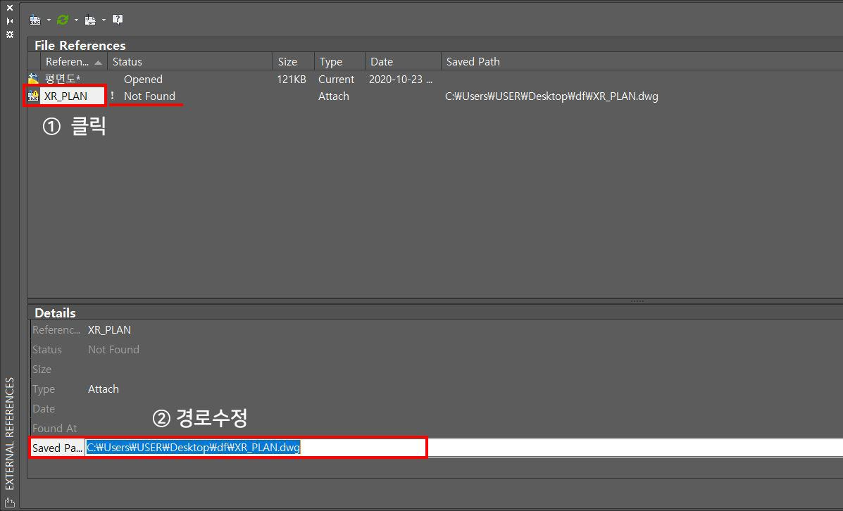 3. Xref 창이 뜹니다. 보면 Not Found 라고 파일이 누락됐다고 느낌표가 뜹니다. 클릭해주면, 아래에 경로를 수정할 수 있습니다.