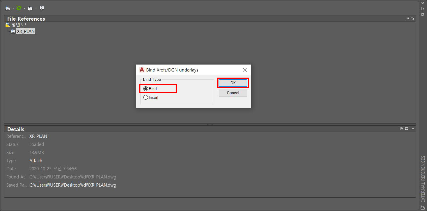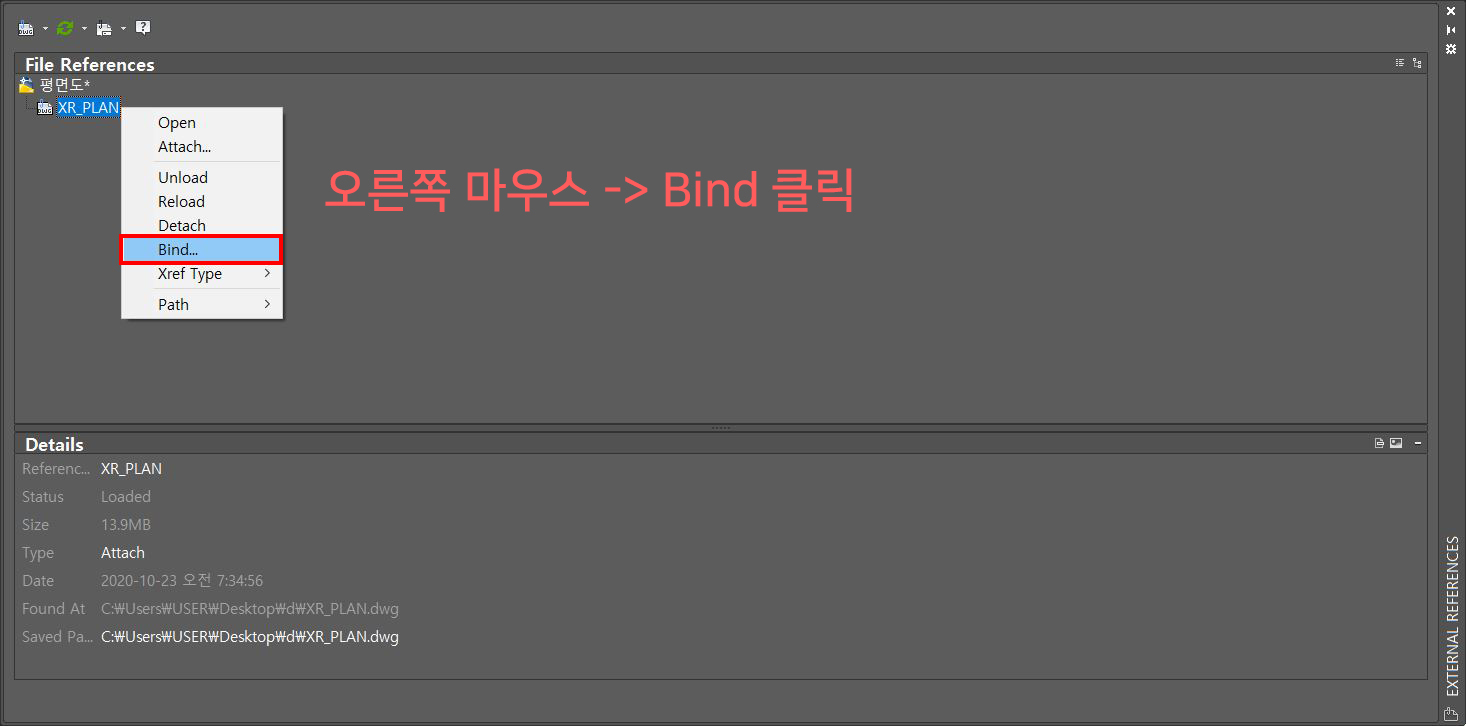 외부참조된 도면을 현재도면에 포함시켜서 수정하거나 해야할때가 있습니다. 외부참조된 도면은 현재 도면에서 수정이 안되니까요.