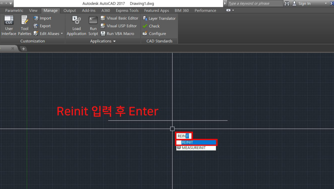 수정한 단축키를 창을 끄지 않고, 바로 적용해봅시다. Reinit 입력 후 Enter 칩니다.