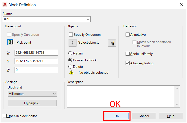 4. 기준점을 선택하고, 블록정의 창으로 들어오면 OK 눌러줍니다.