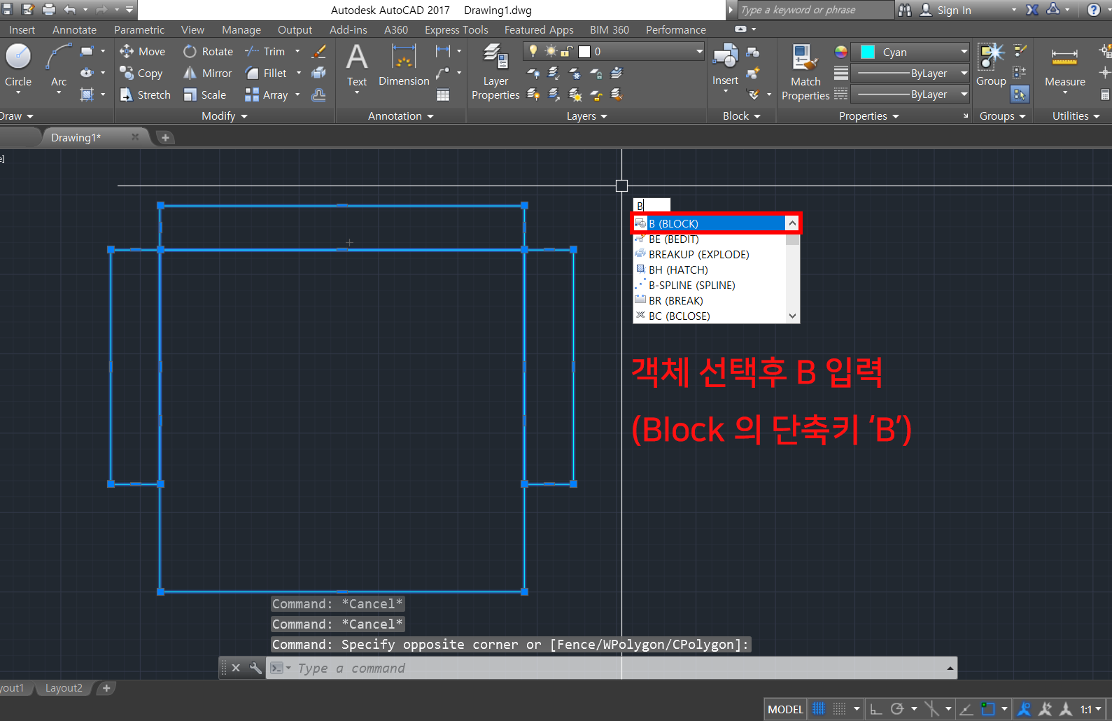 1. 블록으로 만들고 싶은 객체를 선택한 후 'B'를 입력합니다.