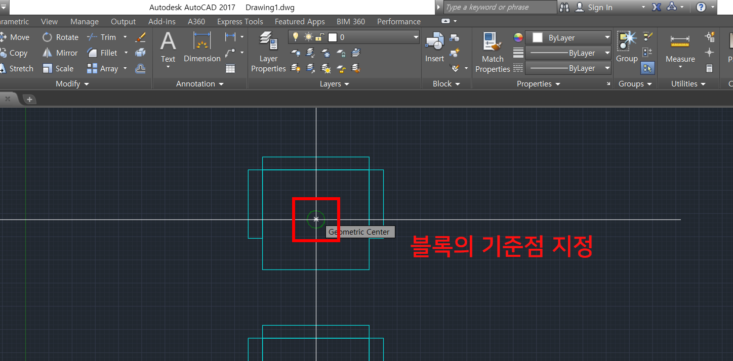 3. 지정하고 싶은 블록읙 기준점을 선택하여줍니다. 저는 객체의 중심점으로 기준점을 지정하였습니다.