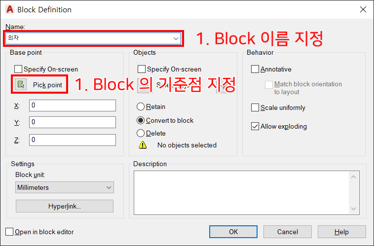 2. 블록 생성 창이 뜹니다. 지정하고 싶은 이름을 입력한 후, 블록의 기준점(Pick point)을 선택합니다.