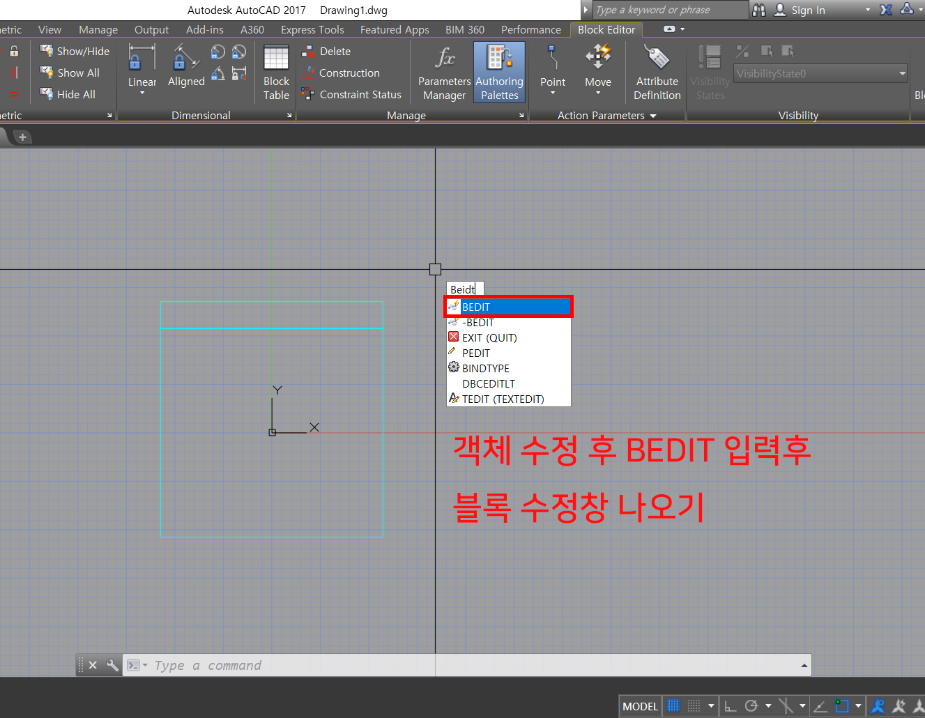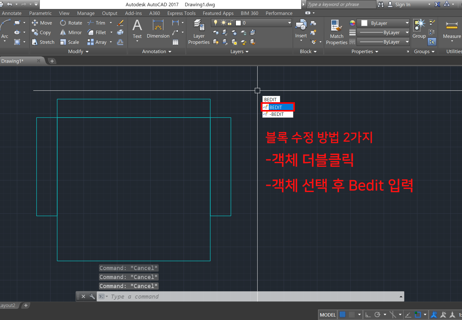 1. 만든 블럭을 수정하기 위해서 블록되어져 있는 객체를 더블클릭하던지, 객체 선택 후 Bedit을 입력합니다.