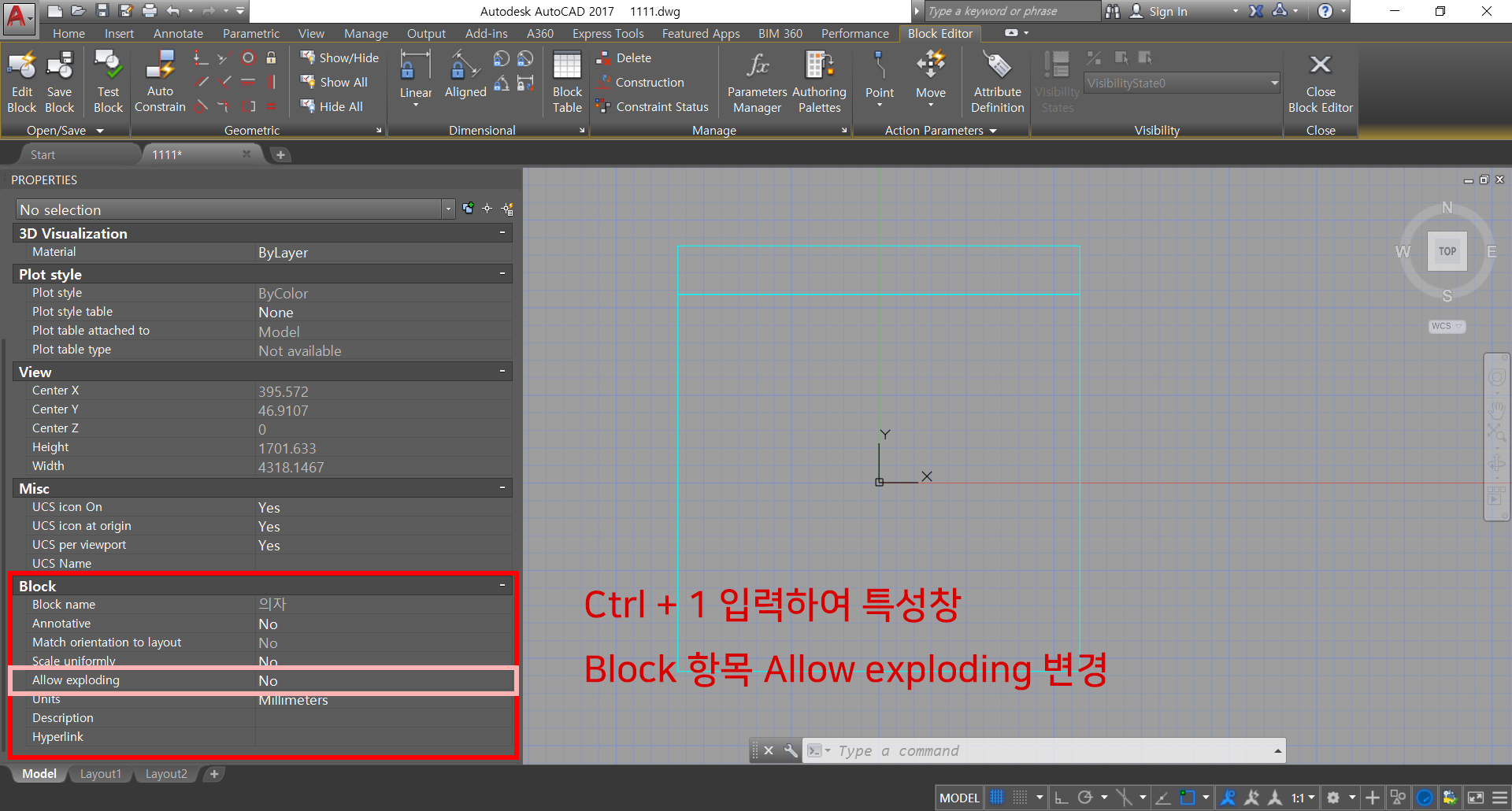 3. Ctrl + 1 을 입력하여 특성창을 열어줍니다. 맨 아래에 Block 탭 중에 Allow exploding 항목을 찾습니다.