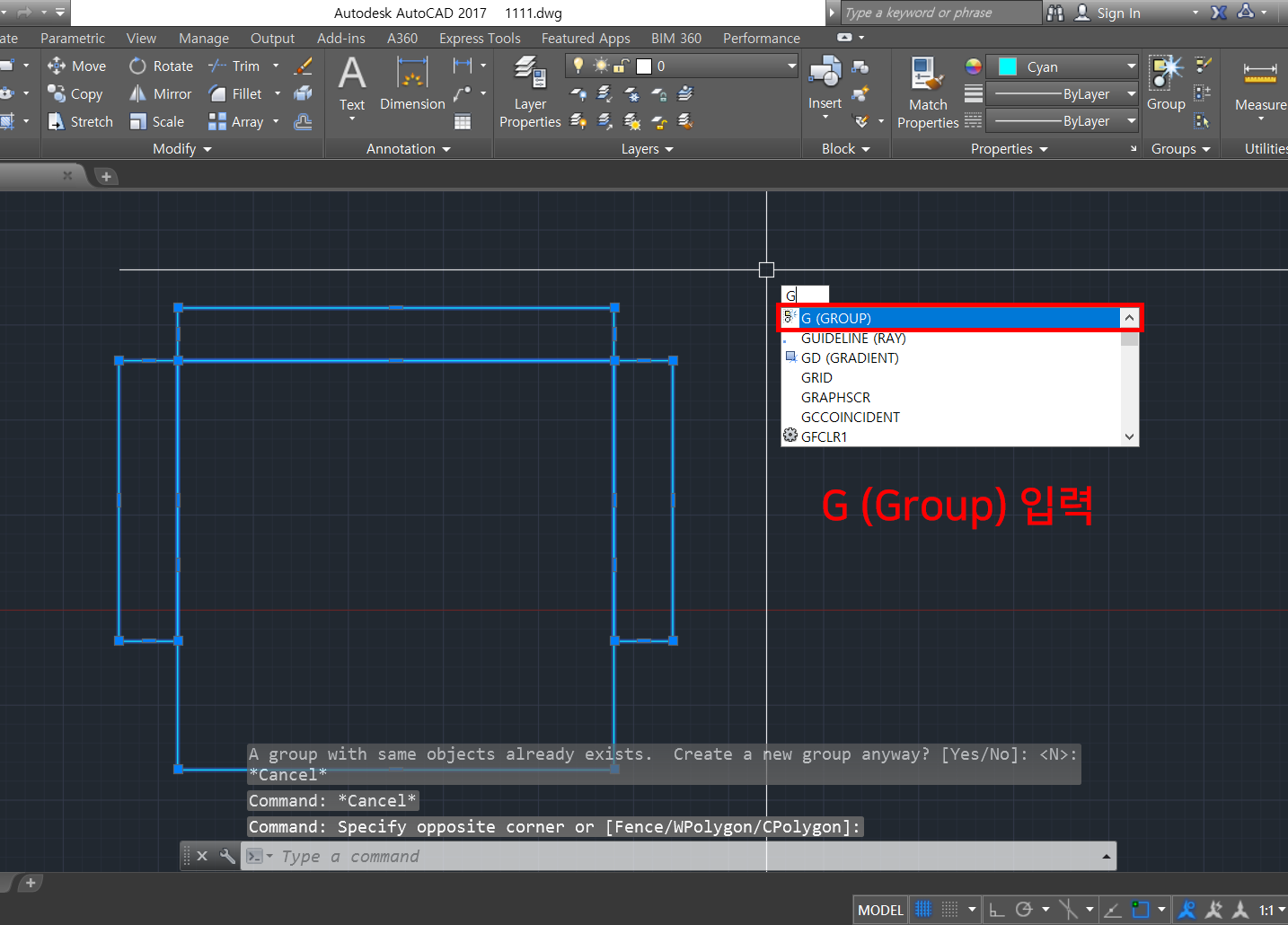 1. G (Group의 단축키)를 입력합니다.