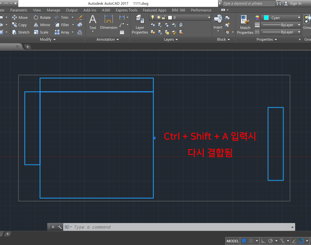4. 그리고 그룹의 특성은 블록과 좀 다릅니다. 'Ctrl + Shift + A' 를 다시 입력하면 결합이 됩니다. 즉, 영구적인 분해가 아니라 일시적 분해가 된다는 뜻입니다. (묶여있던 그룹의 일부를 이동해서 'Ctrl + Shift + A' 를 입력하면 이동한 그대로 결합이 되어져 있는 것을 확인할 수 있습니다)