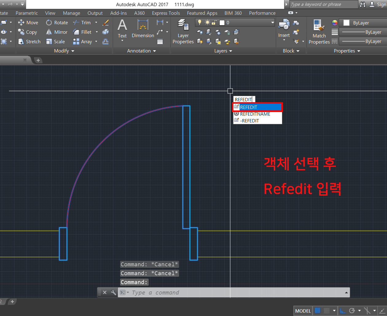 1. 객체 선택 후 Refedit 을 입력하면 편집창으로 들어갑니다.