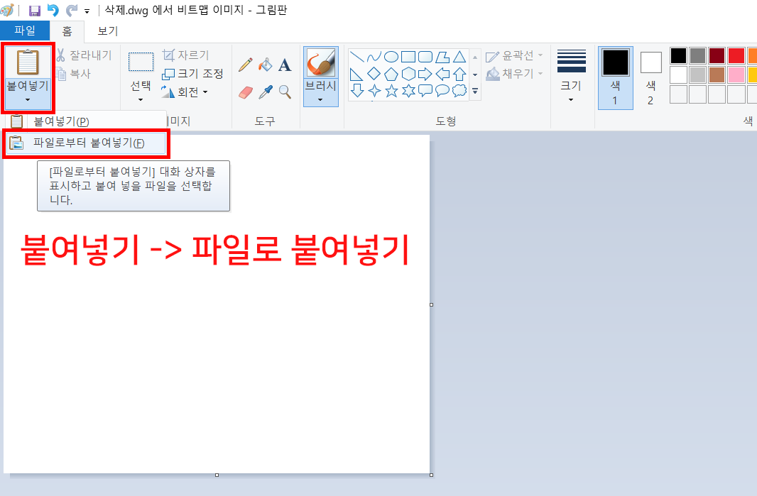 5. 그림판 창이 뜨게 됩니다. 붙여넣기에서 파일로부터 붙여넣기를 클릭합니다.