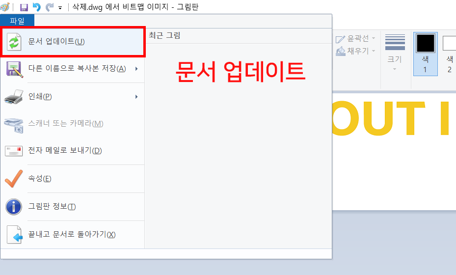 8. 파일 탭의 문서 업데이트를 클릭한 후 그림판을 꺼줍니다.