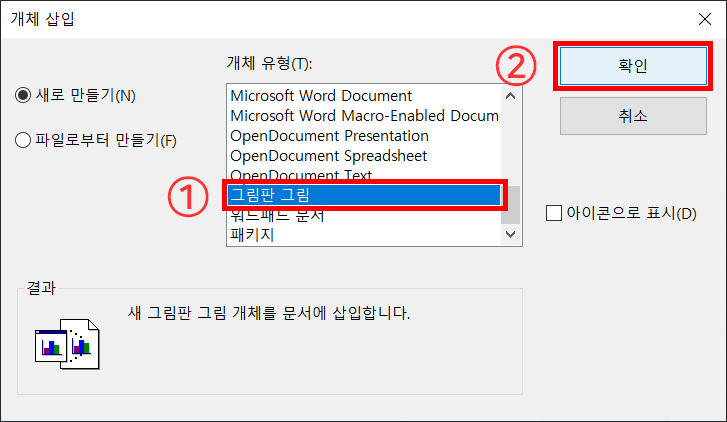 4. 개체삽입 창이 뜨면 그림판 그림을 선택하고 확인을 눌러줍니다.