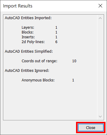 4. Close 해줍니다. layer가 몇개고, 블록 등이 몇 개 인지 알려주는 창입니다.
