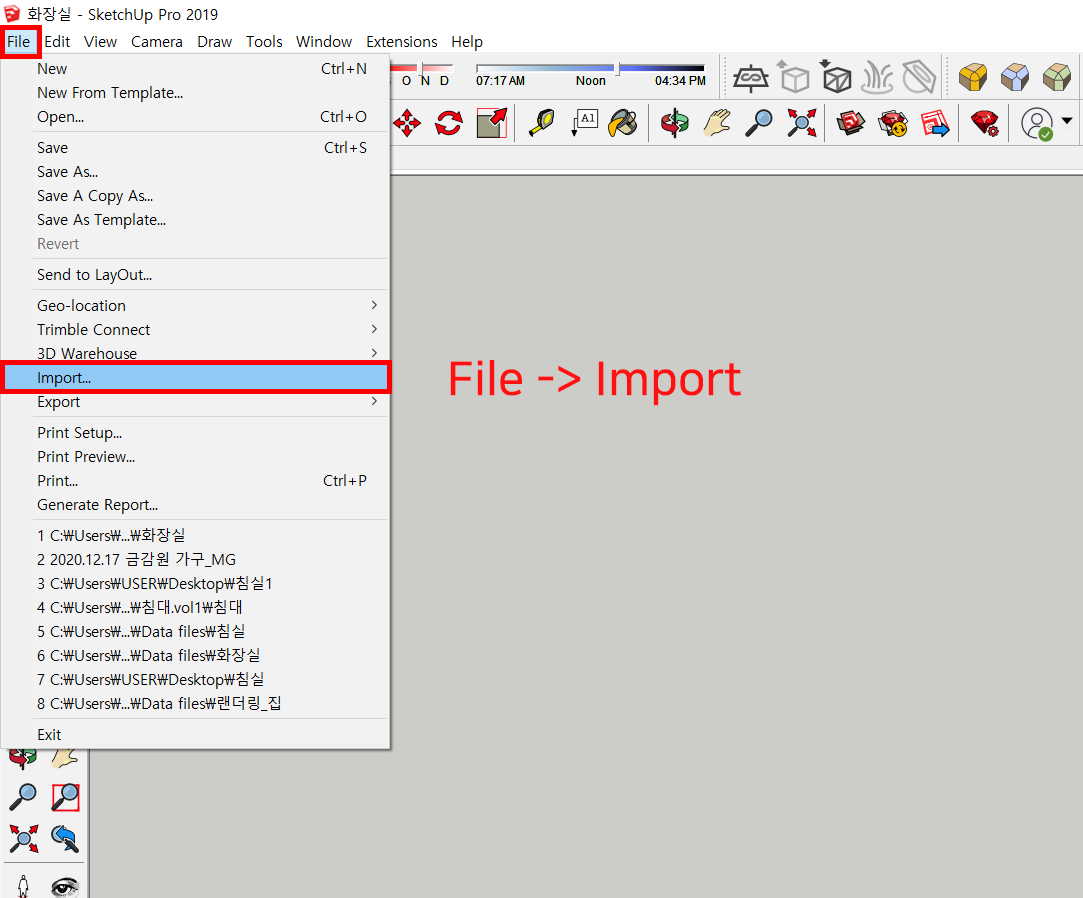 1. 스케치업 File -> Import (가져오기) 합니다.