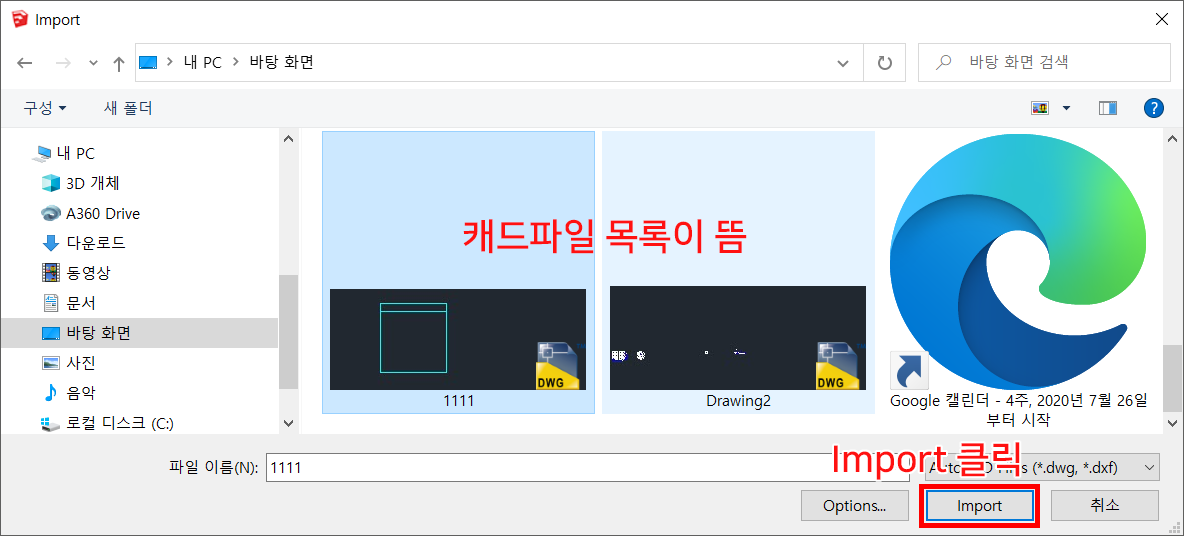 3. Auto Cad Files 를 선택하면, 캐드 파일 목록이 뜹니다. Import 클릭합니다.