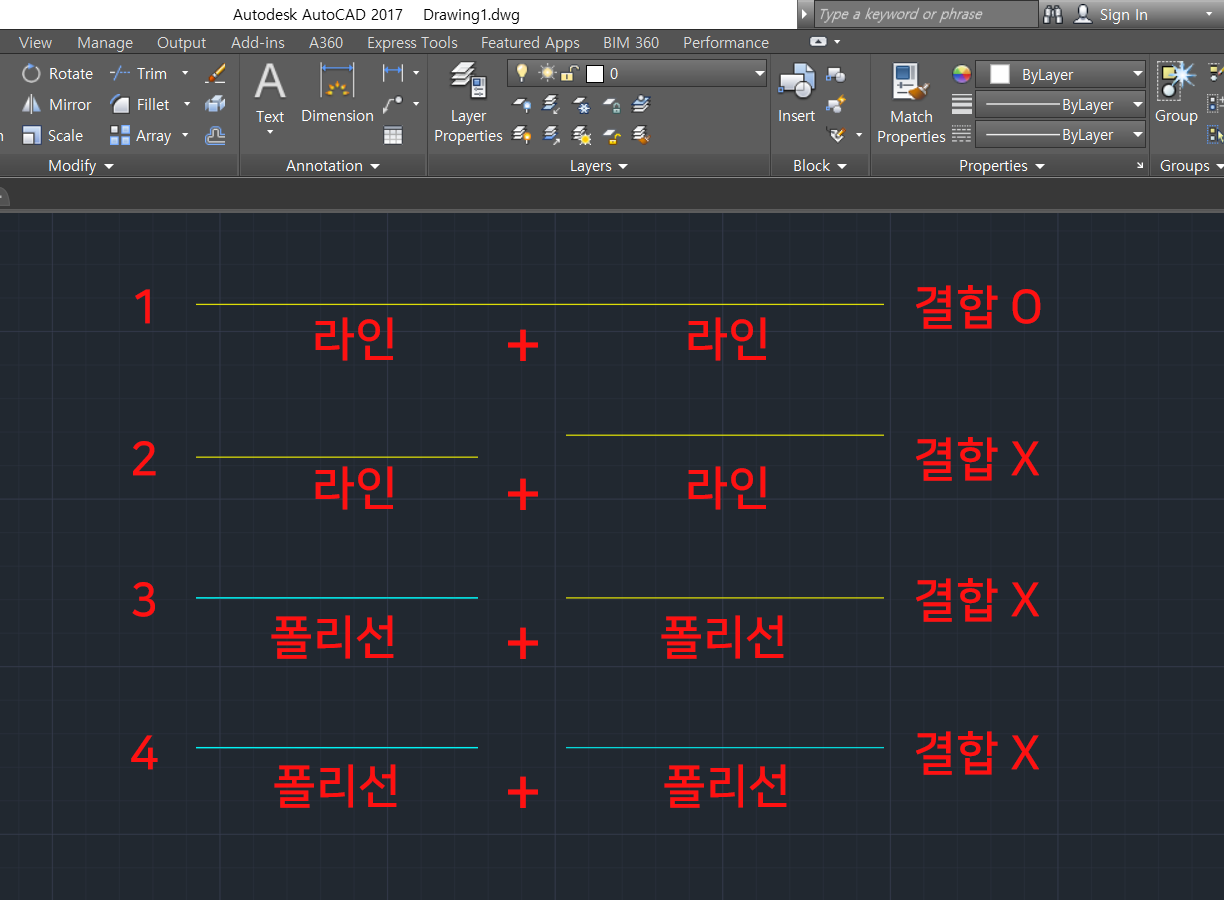 3번, 4번과 같이 폴리선과 결합 혹은 폴리선끼리 결합은 이어지지 않습니다.