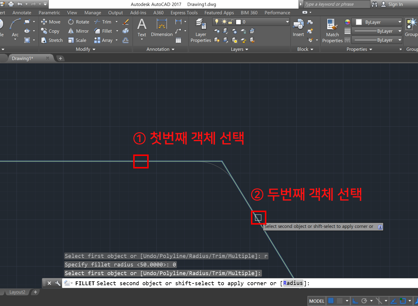 4. 둥글게 만들 첫번째 선을 선택한 후, 둥글게 만들 두번째 선을 선택합니다.
