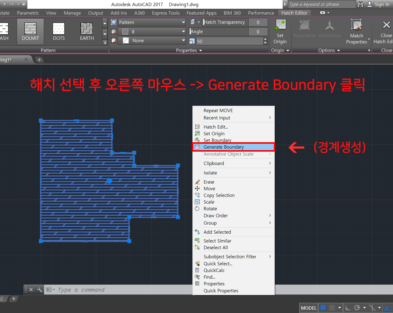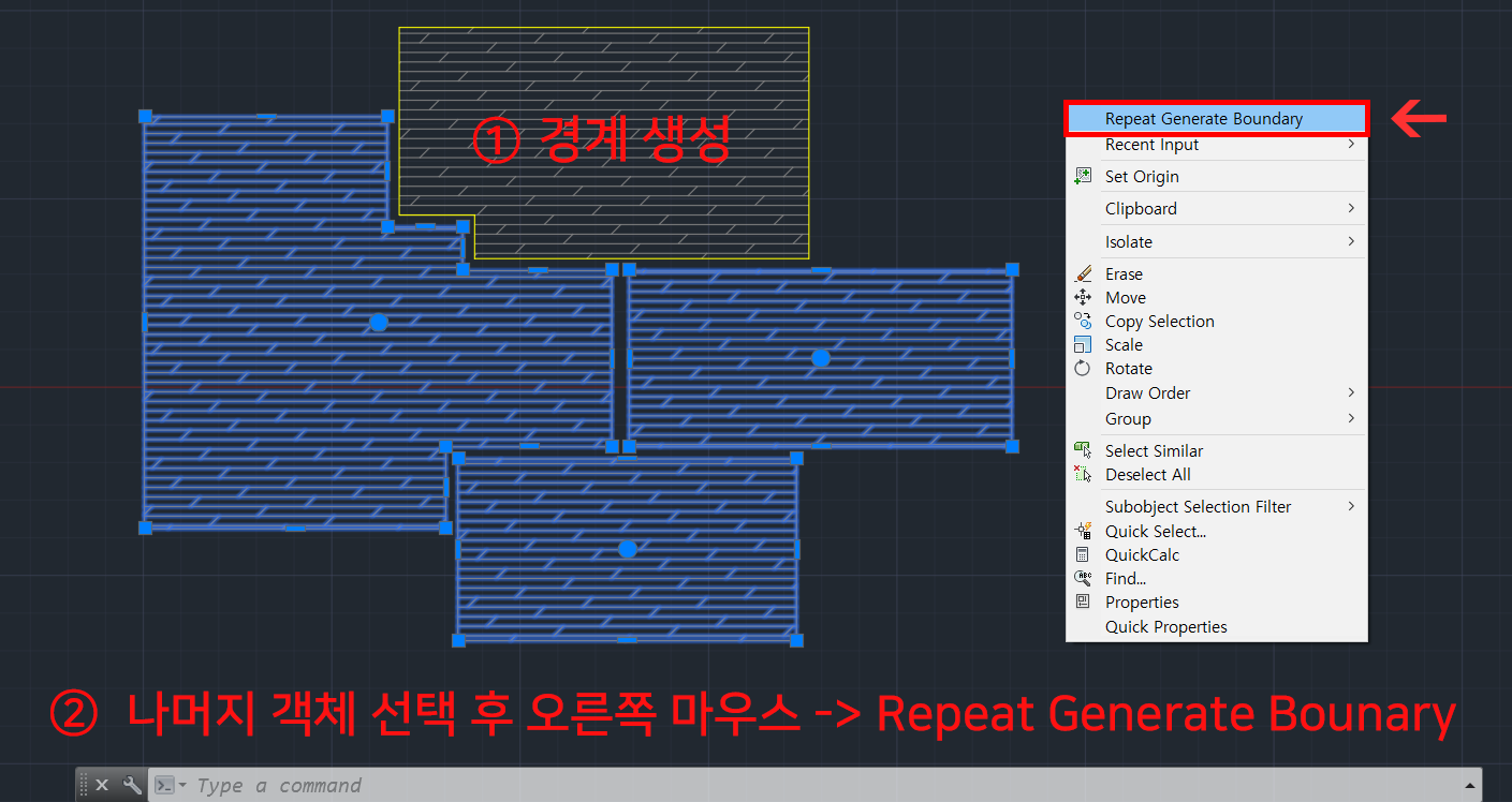 2. 생성후에 나머지 해치를 모두 선택한 뒤 오른쪽 마우스를 클릭 후 창이 뜨면 Repeat Generate Boundary (반복경계생성)을 클릭합니다. 해치 여러개의 경계가 생성됩니다.