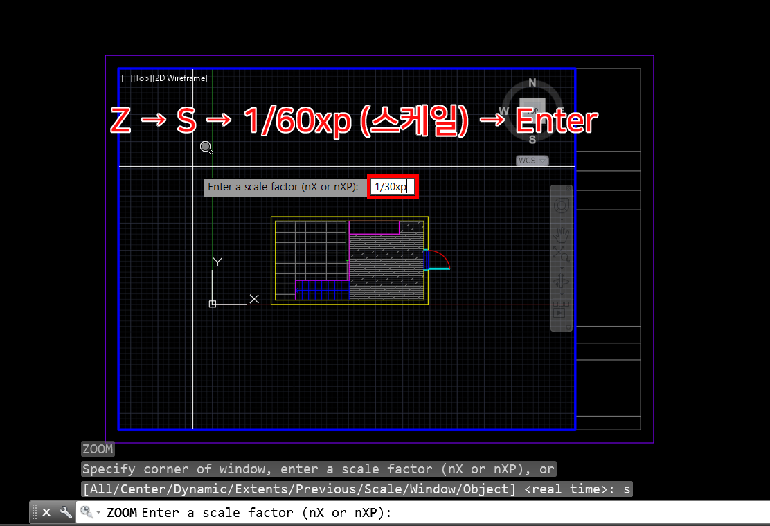 Z → S → 1/00xp (엠뷰 창의 스케일) → Enter 를 입력하면 스케일 조정이 가능합니다.