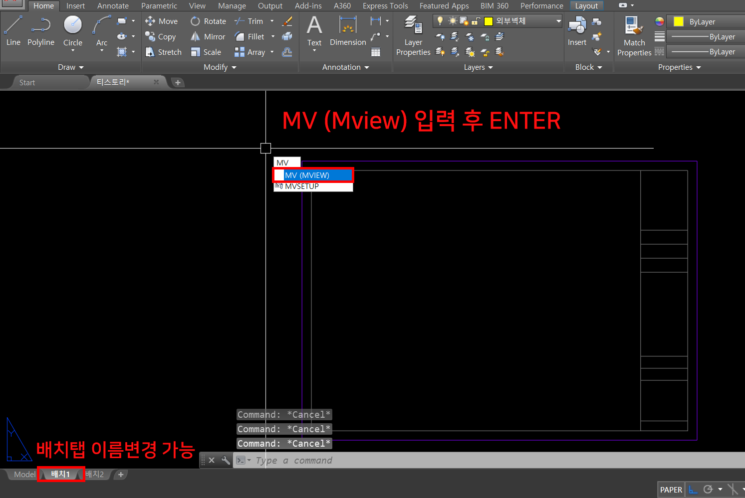뷰포트를 만들기 위해 MV (Mview) 입력 후 Enter 입력합니다.