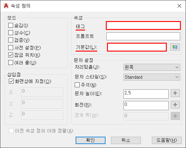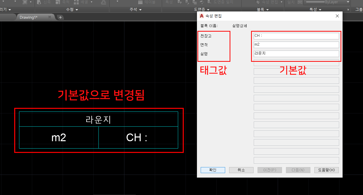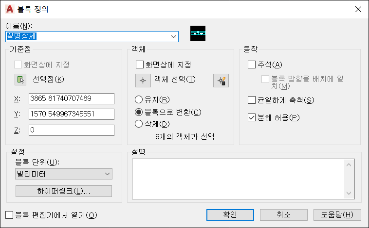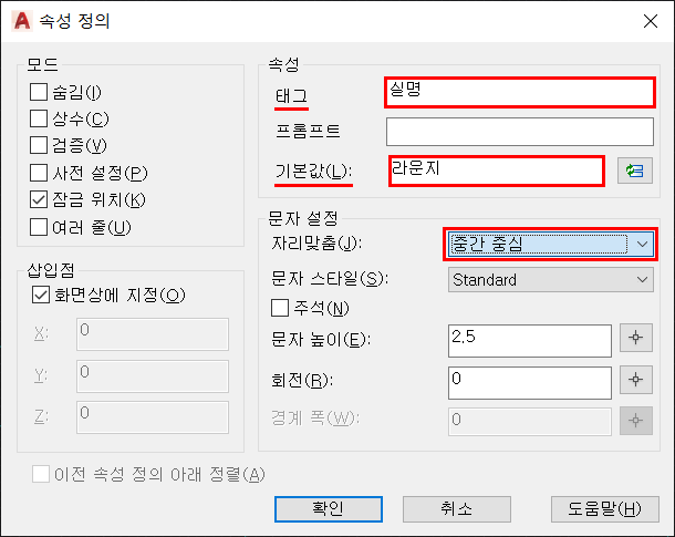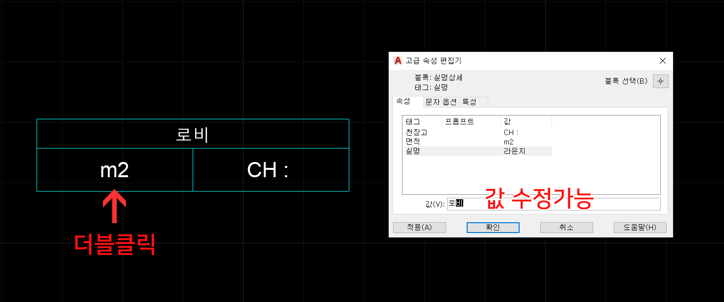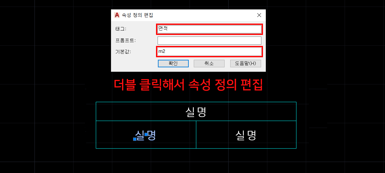 7. 블록을 만들고 확인을 누르면, 아래와 같이 속성편집 창이 뜹니다.