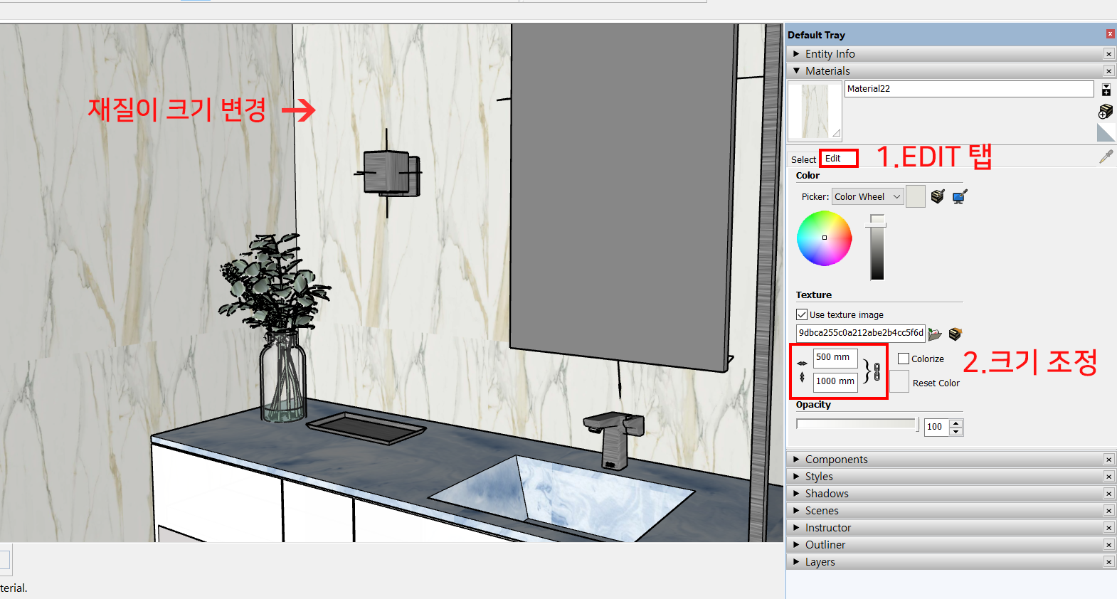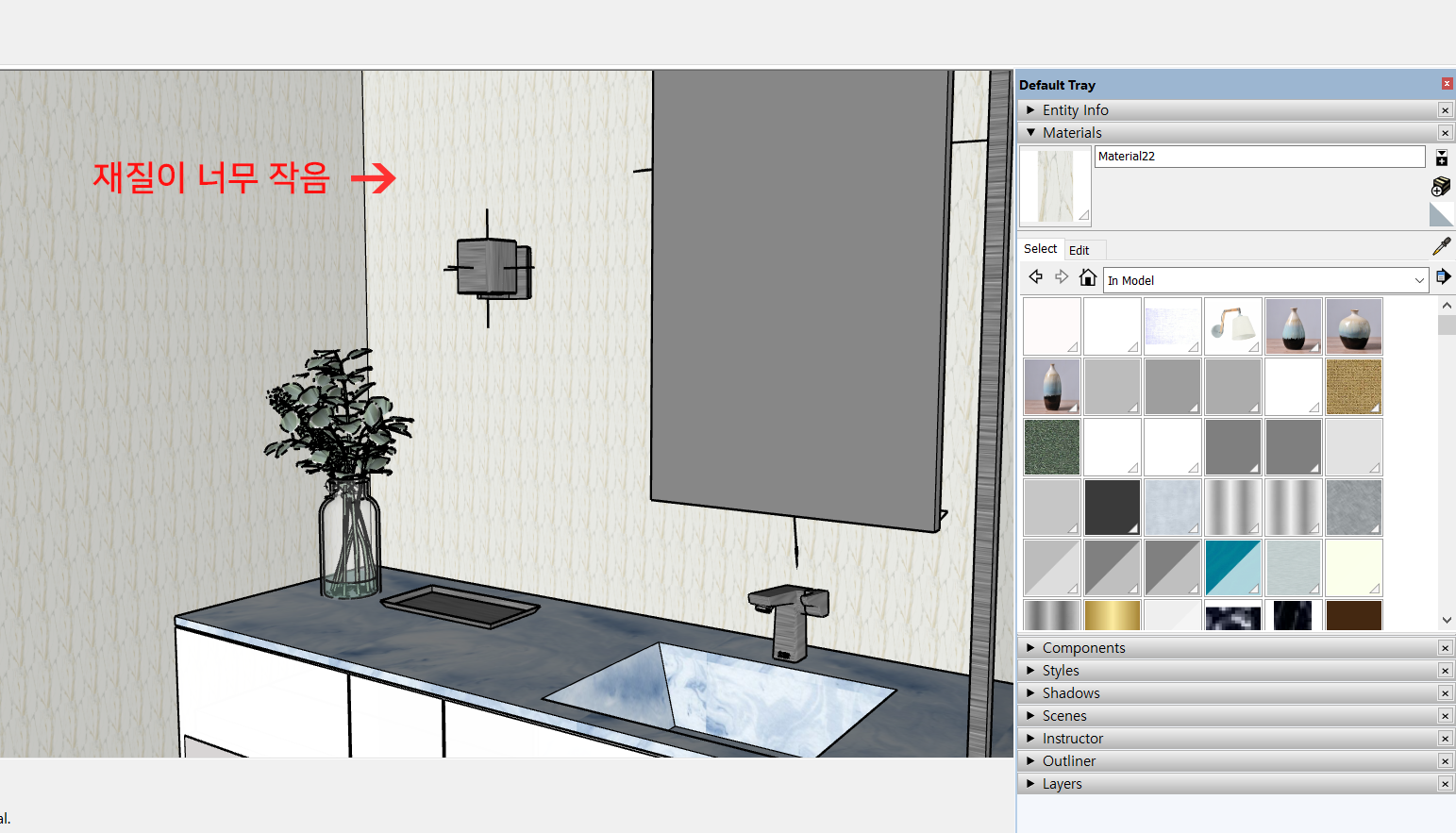 5. 불러와진 재질의 크기가 너무 작습니다. 재질의 크기를 좀 조정해 보고자 합니다.
