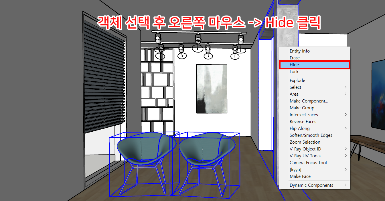 스케치업 작업을 하다보면 객체를 지우긴 그렇고, 잠깐 안보이게 해야할 때가 있습니다.